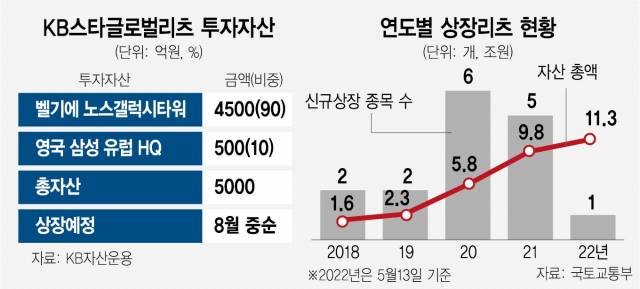 KB스타글로벌리츠의 총자산 규모는 5000억 원이다. 자산의 약 90%인 4500억 원은 노스갤럭시타워에, 나머지 10%(500억 원)는 영국 런던에 있는 삼성 유럽 HQ에 투자한다. 7월 초 기관투자가를 대상으로 상장 전 지분투자(프리 IPO)를 진행하고 개인투자자 대상 공모는 8월 중순께 이뤄질 것으로 예상된다. 노스갤럭시타워와 삼성 유럽 HQ 건물의 임차인은 벨기에 건물관리청과 삼성전자 유럽법인 등이며 각각 10년·15년 정도의 임차 기간이 남아 있다.
