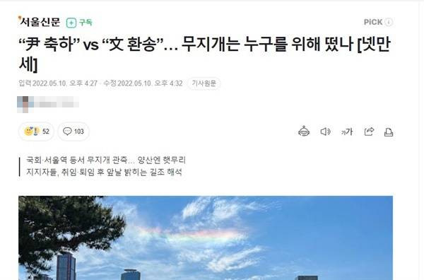 | ▲ 서울신문 온라인판의 10일자 기사 <"尹 축하" vs "文 환송"... 무지개는 누구를 위해 떴나> 캡처 |