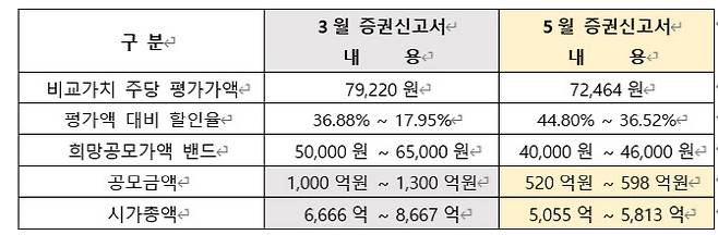 이후 보로노이는 투자자 보호, 회사 성장 전략, 시장 상황 등을 다방면으로 고려해 공모 재도전을 결정했다. 조정 공모 주식수는 130만주로 줄였고, 공모 예정가는 기존 5만원에서 4만원으로 낮췄다. 총 공모금액은 520억원(공모가액 밴드 하단 기준)이다. 주당 평가액 대비 할인율도 44.8%로 대폭 높였다.