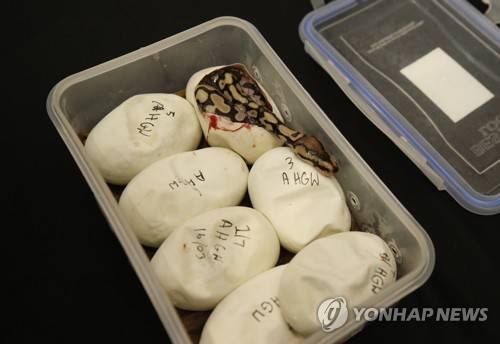 epa09944847 A reborn snake Ball Python after eggs hatching at an event by the Seacon Bang Khae shopping centre in collaboration with the Specialty Pet Lovers Association (TEPA), in Bangkok, Thailand, 13 May 2022. During the event called 'Exotic Friends & Contest' that for the first time runs in Thailand from 13 to 22 May, the fans of exotic animals and pet lovers are able to meet exotic animals, such as the lions, but also frogs, birds and snakes and attend various activities with them. EPA/NARONG SANGNAK
