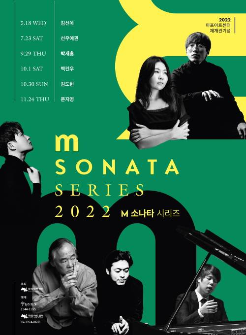 마포문화재단은 리모델링을 마친 마포아트센터 재개관을 기념해 한국의 대표적 피아니스트들의 릴레이 리사이틀 ‘M 소나타 시리즈’(포스터)를 이달부터 11월까지 6회 개최한다. 김선욱 백건우 선우예권 문지영 박재홍 김도현 등 6명이 출연한다.