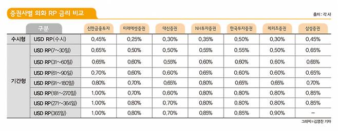 시중 금리가 크게 오르면서 증권사들은 달러RP의 금리를 1.15~0.25%포인트씩 인상했다. NH투자증권의 경우 금리가 가장 높은 1년물 이자를 기존 1.45%에서 1.6%로 인상했다. 미래에셋증권의 RP 1년물은 지난달 1.5%에서 1.75%로 올랐다.