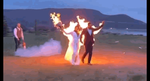 준비된 부케에서 시작된 불은 순식간에 신랑신부의 등으로 번졌고, 이들 부부는 타오르는 불길을 업고 피로연장을 행진했습니다.