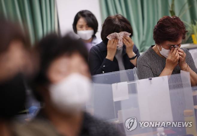 (서울=연합뉴스) 신준희 기자 = 스승의 날을 하루 앞둔 14일 마포구 일성여자중고등학교에서 열린 스승의 날 행사에서 학생들이 '스승의 은혜' 노래를 부르며 눈물을 훔치고 있다.