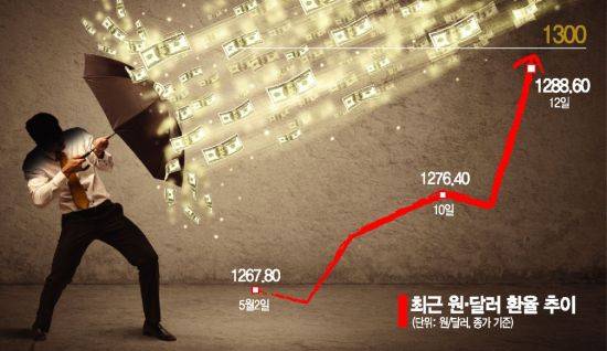 오창섭 현대차증권 연구원은 "원·달러 환율이 1300원을 찍은 것은 글로벌 금융위기 등 비상 상황이었는데 최근 환율 흐름을 보면 상반기 뚫을 가능성이 높다"면서 "다만 정부가 1300원 저지를 위해 총력전에 나설 것으로 예상돼 추가 베팅을 약화시키는 요인이 될 것"이라고 말했다.