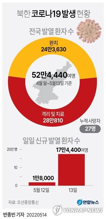 (서울=연합뉴스) 반종빈 기자 = 북한은 14일 전날 하루 동안 전국적으로 17만4천400여명의 유열자(발열 환자)가 새로 발생했고 21명이 사망했다고 밝혔다.