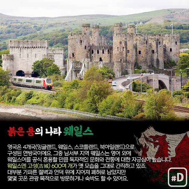 (서울=연합뉴스) 영국은 4개 나라(잉글랜드, 웨일스, 스코틀랜드, 북아일랜드)로 구성된 연방국입니다. 그중 영국 남서부 지역 웨일스는 영어 외에 웨일스어를 공식 혼용할 만큼 독자적인 문화와 전통에 대한 자긍심이 높습니다. 웨일스엔 고성(古城) 600여 개가 옛 모습을 그대로 간직하고 있죠. 대부분 가파른 절벽과 언덕 위에 지어져 폐허로 남아있지만 몇몇 곳은 관광 목적으로 방문하거나 숙박도 할 수 있어요.
