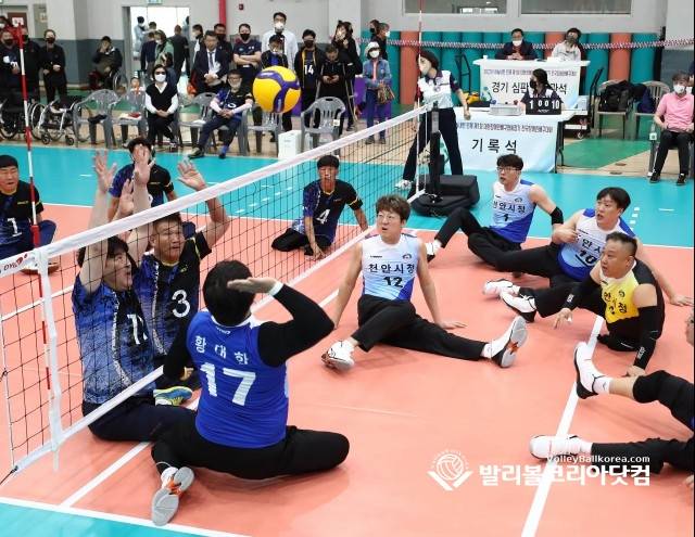 사진은 남자전문 좌식배구 천안시청팀과 정읍단이와풍이팀이 경기를 펼치고 있는 모습.