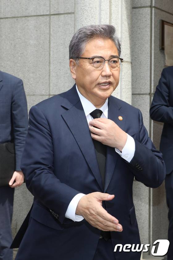 (서울=뉴스1) 황기선 기자 = 박진 외교부 장관이 14일 오후 서울 용산구 아랍에미리트(UAE) 대사관에서 별세한 칼리파 알 나흐얀 UAE 대통령 겸 아부다비 국왕 조문을 마치고 발걸음을 옮기고 있다. 2022.5.14/뉴스1
