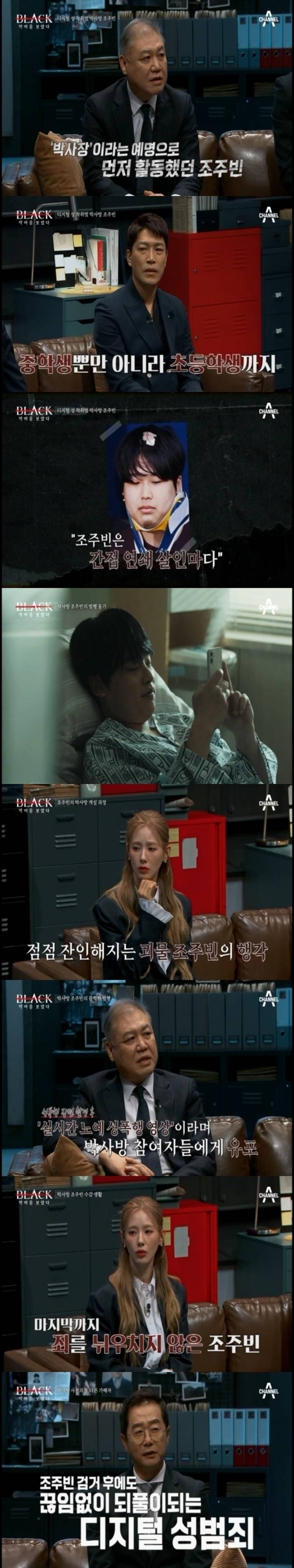5월 13일 방송된 채널A '블랙: 악마를 보았다]'(이하 ‘블랙’)에서는 여성들을 협박해 성 착취물을 제작, 수십 개의 채팅방에서 유포하는 디지털 성범죄 사건으로 세간을 뒤흔든 ‘박사’ 조주빈의 비뚤어진 가치관을 파헤쳤다. 조주빈은 6개월의 범행기간 동안 74명의 피해자를 만들었고, 그 중 16명은 미성년자였다. 프로파일러 권일용은 “밝혀지지 않은 피해자는 훨씬 더 많을 것”이라고 전해 안타까움을 자아냈다.