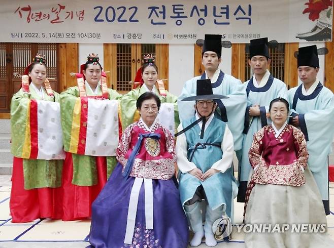 (서울=연합뉴스) 오는 16일 성년의 날을 앞두고 14일 서울 마포구 광흥당에서 열린 '2022년 전통 성년식' 참석자들이 기념촬영을 하고 있다. 마포문화원이 주최하고 사단법인 한국예절문화원이 주관한 이번 전통 성년식은 코로나19 이후 2년 만에 대면 행사로 개최됐다. 2022.5.14 [마포구청 제공. 재판매 및 DB 금지]