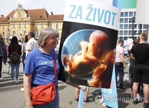 epa09946312 A woman protests against abortion abortion in downtown Zagreb, Croatia, 14 May 2022. People take part in 'Walk of Life' events to promote the belief that the human life begins with conception and ends with natural death, and that the right to life is a fundamental human right. EPA/ANTONIO BAT