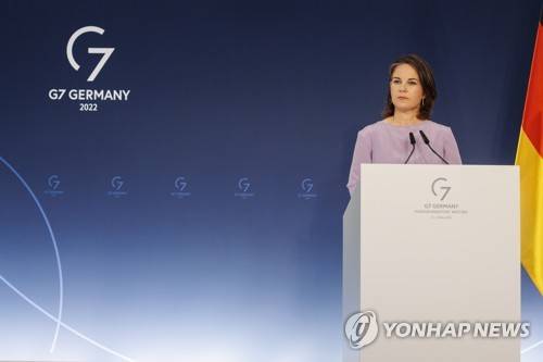 epa09946336 German Foreign Minister Annalena Baerbock speaks during a press conference after the meeting of foreign ministers of the G7 member states at the Schlossgut Weissenhaus venue near Oldenburg in Holstein, Germany, 14 May 2022. The three-day conference is focusing on the current Russian war in Ukraine. The foreign ministers of Ukraine and Moldova are also attending. EPA/Morris MacMatzen / POOL