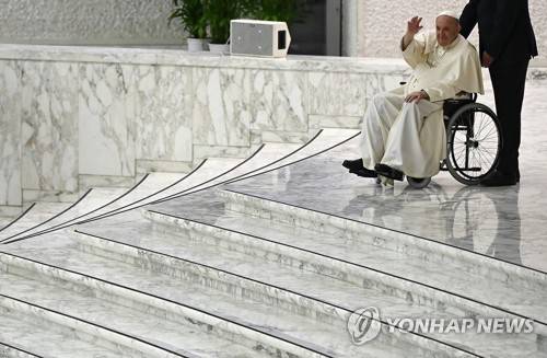 epa09946353 Pope Francis in a wheelchair attends an audience with pilgrims of the Institute of the Religious Teachers Filippini in the Paul VI hall, Vatican City, 14 May 2022. EPA/Riccardo Antimiani