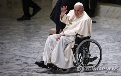 epa09946352 Pope Francis in a wheelchair attends an audience with pilgrims of the Institute of the Religious Teachers Filippini in the Paul VI hall, Vatican City, 14 May 2022. EPA/Riccardo Antimiani
