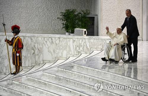 epa09946362 Pope Francis in a wheelchair attends an audience with pilgrims of the Institute of the Religious Teachers Filippini in the Paul VI hall, Vatican City, 14 May 2022. EPA/Riccardo Antimiani
