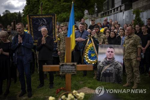 Relatives and friends attend the funeral of Melnyk Andriy, 23, a Ukrainian military servicemen who as killed in Kharkiv province, in Lviv, Ukraine, Saturday, May 14, 2022. (AP Photo/Emilio Morenatti)