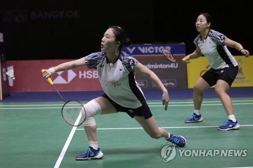 South Korea's Kim Hye-jeong, left, and Kong Hee-yong, return a shot to China's Huang Dong Ping and Li Wen Mei during their women's double final badminton match at Thomas & Uber Cup in Bangkok, Thailand, Saturday, May 14, 2022. (AP Photo/Sakchai Lalit)