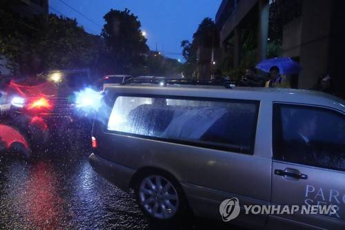 A car arrives to prosecutor offices as transport the coffin with the remains of the late anti-drug prosecutor Marcelo Pecci for a wake, in Luque, Paraguay, Saturday, May 14, 2022. The Paraguayan prosecutor of organized crime and drug trafficking cases was slain on May 10th by gunmen on a Colombian beach as he honeymooned with his new wife. (AP Photo/Jorge Saenz)