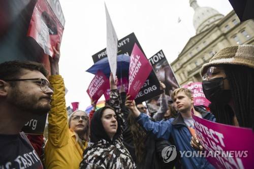 FILE - Abortion-rights advocates, right, try to block anti-abortion signage during a rally at the state capitol in Lansing, Mich., May 2, 2022, in support of abortion rights after a draft of the Supreme Court opinion was leaked in favor of overturning Roe v. Wade. Voters in 32 states will cast ballots this year on state supreme court seats, as those races have become increasingly politicized over issues such as partisan gerrymandering and abortion, especially in states such as North Carolina and Michigan with narrow political divides. (Matthew Dae Smith/Lansing State Journal via AP, File) FILE PHOTO. MANDATORY CREDIT; NO LICENSING EXCEPT BY AP COOPERATIVE MEMBERS