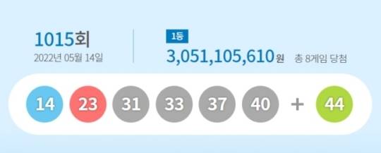 로또복권 운영사 동행복권은 제1015회 로또복권 추첨에서 '14, 23, 31, 33, 37, 40'이 1등 당첨번호로 뽑혔다고 14일 밝혔다. 2등 보너스 번호는 '44'이다.
