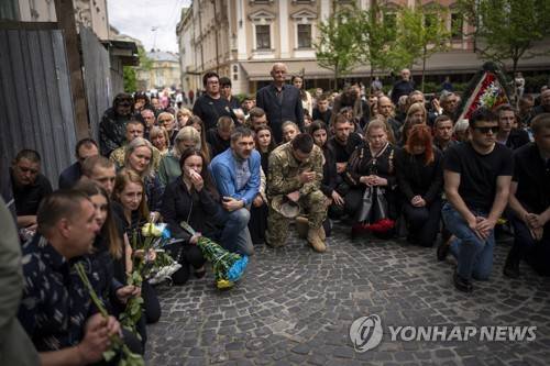 Relatives and friends react during the funeral of Melnyk Andriy, Shufryn Andriy and Ankratov Oleksandra, three Ukrainian military servicemen who were killed in the east of the country, in Lviv, Ukraine, Saturday, May 14, 2022. (AP Photo/Emilio Morenatti)