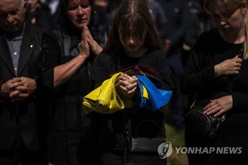 Shufryn Lilia, 17, holding a Ukrainian flag, cries next to the coffin of her father Shufryn Andriy, 41, a Ukrainian military servicemen who as killed in the east, during his funeral in Lviv, Ukraine, Saturday, May 14, 2022. (AP Photo/Emilio Morenatti)