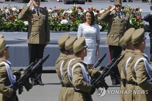 epa09946423 Hungarian President Katalin Novak (C) during her official inauguration ceremony in front of the Parliament, in Budapest, Hungary, 14 May 2022. From left Major General Istvan Kun Szabo, from right Commander of Hungarian Defence Forces Gen. Romulusz Ruszin-Szendi. EPA/Szilard Koszticsak HUNGARY OUT