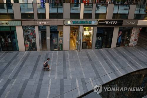 epa09946495 A woman rides a skateboard along establishments in Beijing, China, 14 May 2022. Beijing authorities urged residents to stay at home in the coming weekend and announced another three rounds of nucleic acid tests as an attempt to curb the spread of COVID-19 in the city. EPA/MARK R. CRISTINO