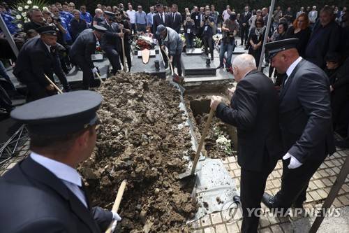 Funeral workers bury the coffin of Ivica Osim, former Bosnian soccer player and coach who played for Yugoslavia and was the former manager of the Japanese national team, during the funeral in Sarajevo, Bosnia, Saturday, May 14, 2022. Osim died on May 1 in Graz, Austria, where he had lived for the past few years. (AP Photo/Armin Durgut)