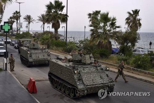 Lebanese army soldiers on armed vehicles patrol a street in Beirut, Lebanon, Saturday, May 14, 2022. Lebanese authorities began distributing ballot boxes to polling stations around the country on Saturday, a day before parliamentary elections were to be held. (AP Photo/Bilal Hussein)