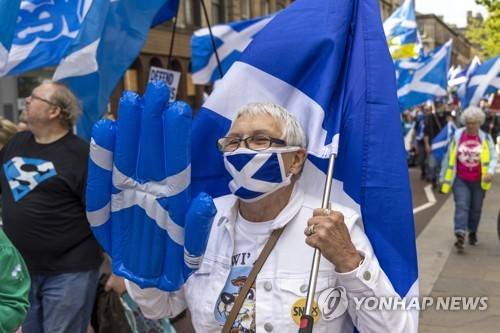 epa09946545 People take part in the All Under One Banner (AUOB) march for independence and protest against the privatisation of the NHS through the city of Glasgow, Scotland, 14 May 2022. EPA/ROBERT PERRY