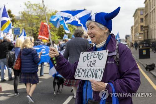 epa09946546 People take part in the All Under One Banner (AUOB) march for independence and protest against the privatisation of the NHS through the city of Glasgow, Scotland, 14 May 2022. EPA/ROBERT PERRY
