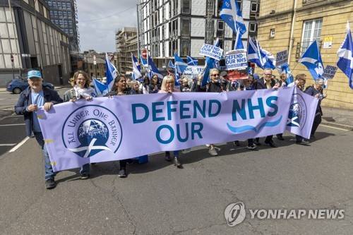 epa09946544 People take part in the All Under One Banner (AUOB) march for independence and protest against the privatisation of the NHS through the city of Glasgow, Scotland, 14 May 2022. EPA/ROBERT PERRY