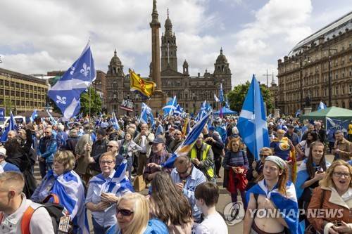 epa09946552 People take part in the All Under One Banner (AUOB) march for independence and protest against the privatisation of the NHS through the city of Glasgow, Scotland, 14 May 2022. EPA/ROBERT PERRY