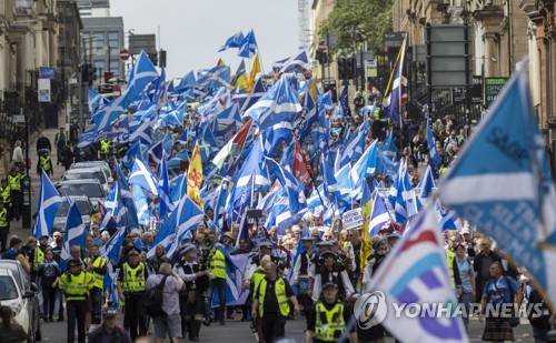 epa09946554 People take part in the All Under One Banner (AUOB) march for independence and protest against the privatisation of the NHS through the city of Glasgow, Scotland, 14 May 2022. EPA/ROBERT PERRY