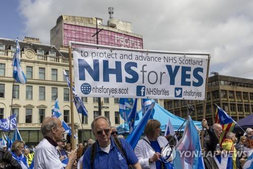 epa09946576 People take part in the All Under One Banner (AUOB) march for independence and protest against the privatisation of the NHS through the city of Glasgow, Scotland, 14 May 2022. EPA/ROBERT PERRY