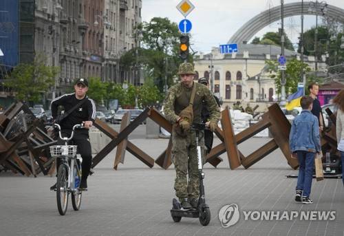 A Ukrainian soldier rides a scooter in front of anti-tank hedgehogs in central Kyiv, Ukraine, Saturday, May 14, 2022. (AP Photo/Efrem Lukatsky)