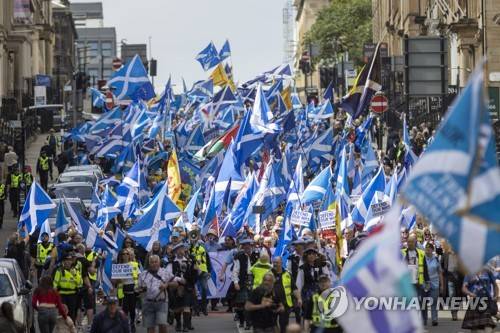epaselect epa09946549 People take part in the All Under One Banner (AUOB) march for independence and protest against the privatisation of the NHS through the city of Glasgow, Scotland, 14 May 2022. EPA/ROBERT PERRY