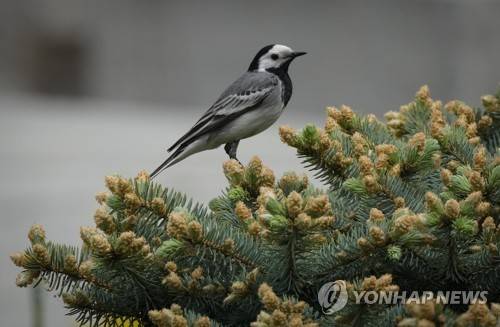A wagtail sits on a spruce tree in Kyiv, Ukraine, Saturday, May 14, 2022. (AP Photo/Efrem Lukatsky)
