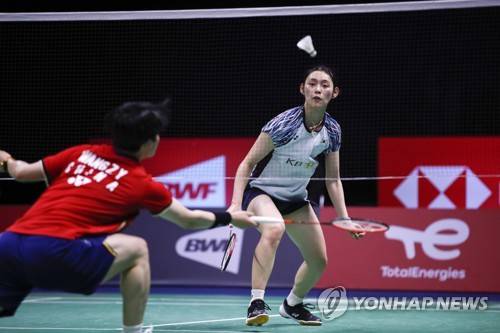 epa09946726 Sim Yu-jin (R) of South Korea in action during her women's singles final match against Wang Zhi Yi (L) of China at the BWF Thomas and Uber Cup Finals 2022 in Nonthaburi, Thailand, 14 May 2022. EPA/DIEGO AZUBEL
