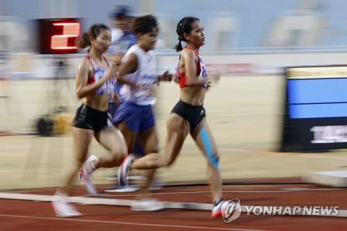 epa09946877 Nguyen Thi Oanh (L) of Vietnam is on her way to win the gold medal in the women's 5,000m final of the Athletic events at 31st Southeast Asian Games (SEA Games 31) in Hanoi, Vietnam 14 May 2022. Nguyen Thi Oanh won ahead of her second placed compatriot Pham Thi Hong Le (R) and Hnin Yu Soe (C) of Myanmar. EPA/LUONG THAI LINH