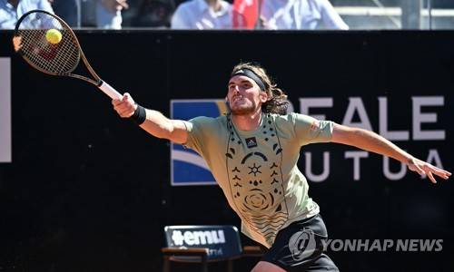 epa09946893 Stefanos Tsitsipas of Greece in action during his men's singles semi final match against Alexander Zverev of Germany at the Italian Open tennis tournament in Rome, Italy, 14 May 2022. EPA/ETTORE FERRARI