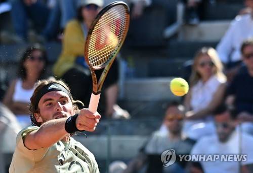 epa09946891 Stefanos Tsitsipas of Greece in action during his men's singles semi final match against Alexander Zverev of Germany at the Italian Open tennis tournament in Rome, Italy, 14 May 2022. EPA/ETTORE FERRARI