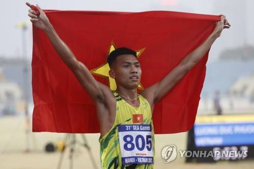 epa09946915 Tran Van Dang of Vietnam celebrates after winning the silver medal in the men's 1,500m final of the Athletic events at 31st Southeast Asian Games (SEA Games 31) in Hanoi, Vietnam, 14 May 2022. EPA/LUONG THAI LINH