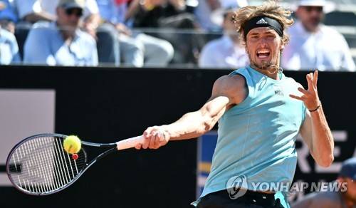 epa09946944 Alexander Zverev of Germany in action during his men's singles semi final match against Stefanos Tsitsipas of Greece at the Italian Open tennis tournament in Rome, Italy, 14 May 2022. EPA/ETTORE FERRARI