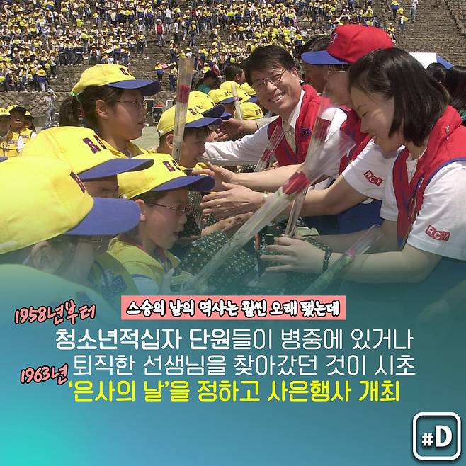 올해로 41회째를 맞지만 스승의 날의 역사는 꽤 오래됐습니다. 1958년부터 충남지역 청소년적십자 단원들이 세계적십자의 날(5월 8일)을 맞아 병중에 있거나 퇴직한 선생님을 찾아가 인사를 하던 것이 그 시작이라고 합니다.