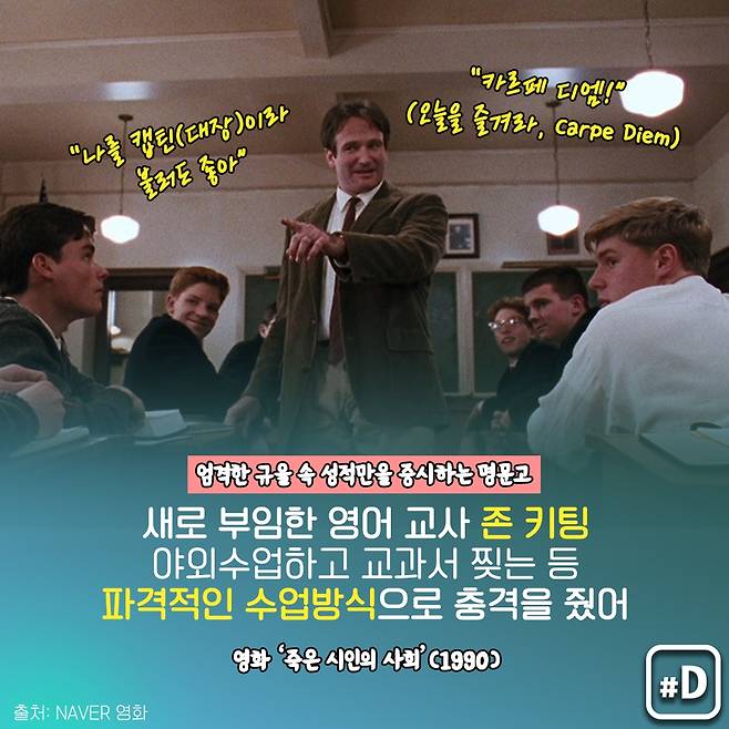 이 영화는 1990년 개봉한 '죽은 시인의 사회'입니다. 지난 2014년 세상을 떠난 배우 로빈 윌리엄스의 명연기가 빛을 발하는 영화죠. 전교조 1세대가 대학에 들어간 해에 개봉한 영화는 입시 교육에 찌든 우리들의 모습과 오버랩되며 깊은 울림을 선사했습니다. 영화 속 키팅은 참된 스승은 어떠해야 하는지를 온몸으로 보여주었죠.