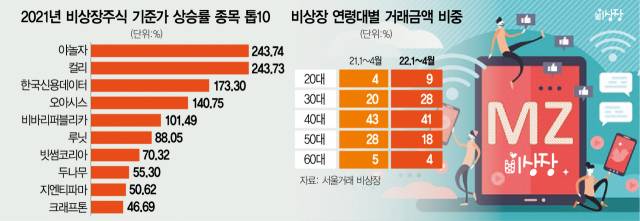 비상장 주식 거래 플랫폼인 ‘서울거래 비상장’에서도 2030의 비중이 지난달 기준 48%이었습니다. 올해 이들의 거래 금액이 차지하는 비중은 37%로 지난해(24%)에 비해 13%포인트 증가했습니다. 통상 비상장 주식 시장에 참여한 4050세대의 비중이 40%대였는데 MZ세대도 참여율이 크게 늘었다는 분석입니다.