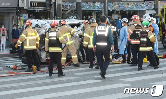 (서울=뉴스1) = 15일 오전 6시 46분쯤 서울 중랑구 면목동 사가정역 교차로에서 차대차 4중 추돌사고 발생, 출동한 소방대원 등이 운전자를 구조하고 있다.